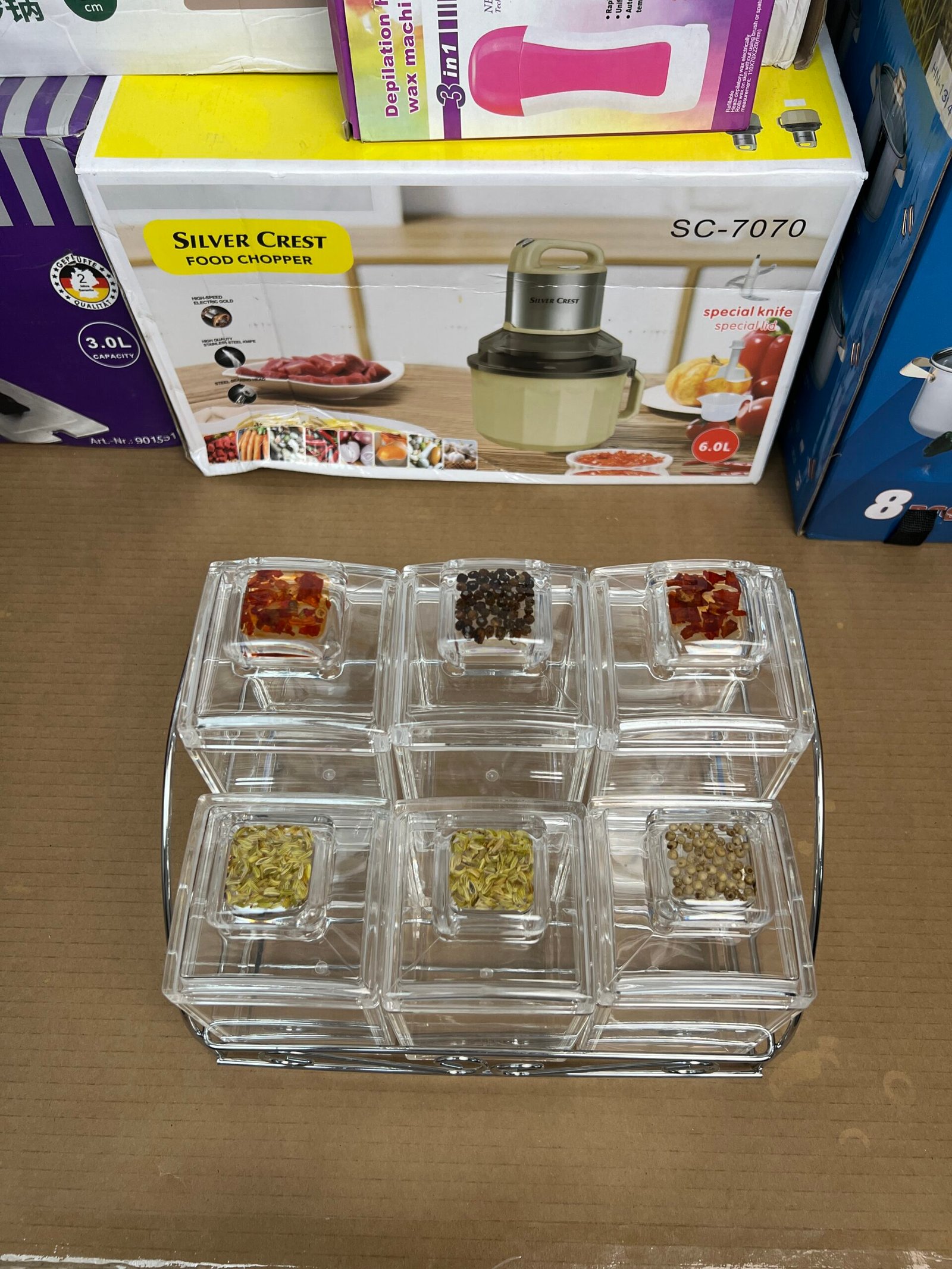 This 6 Pcs Acrylic Spice Jar Set features square-shaped acrylic jars with airtight rubber lids to maintain freshness and aroma. The set includes a sturdy stainless steel stand for organized storage and accessibility. Acrylic spoons are provided for hygienic and effortless spice handling. Crafted with precision in Taiwan, this set balances elegance and functionality, making it a great addition to any kitchen.