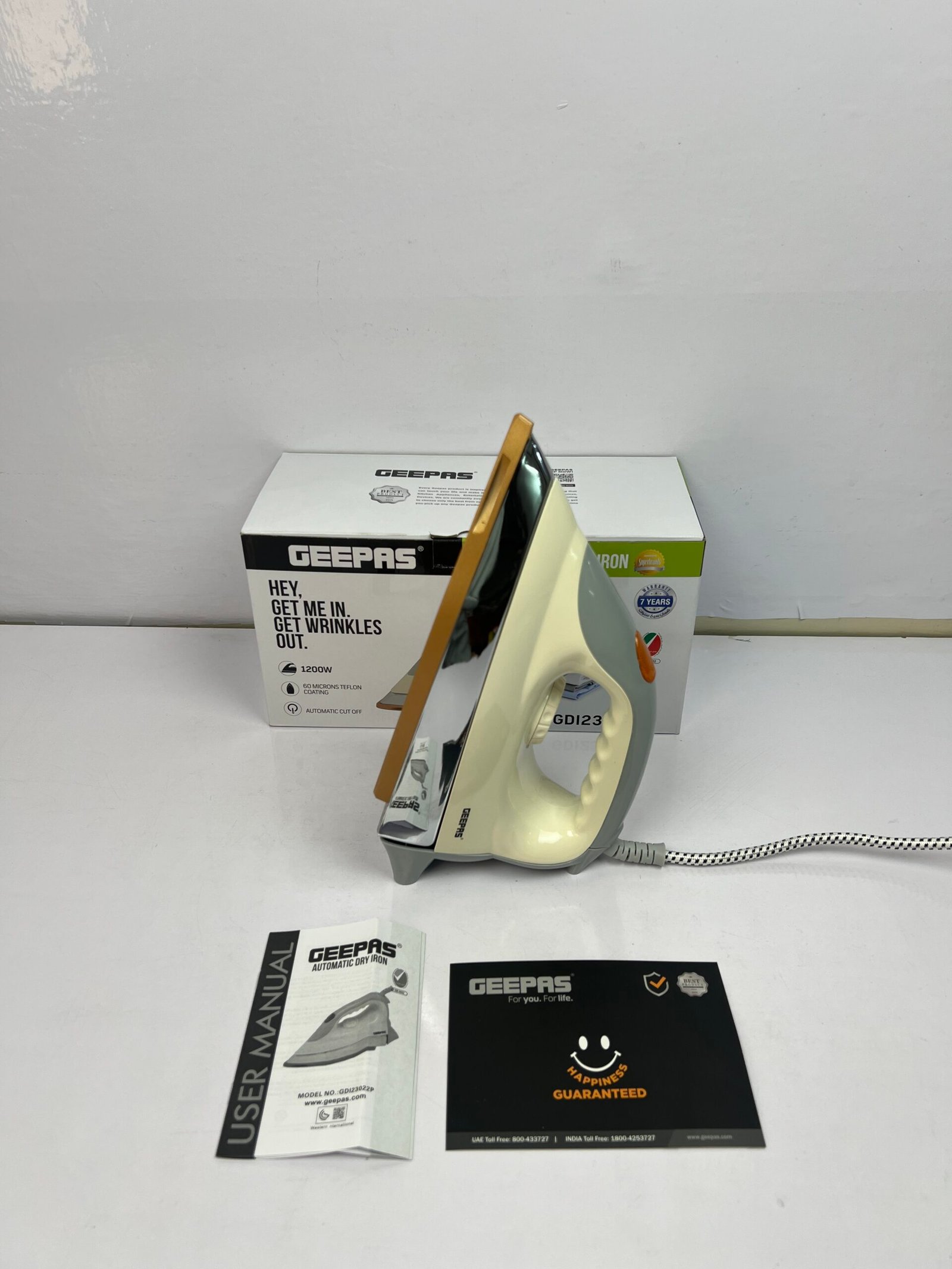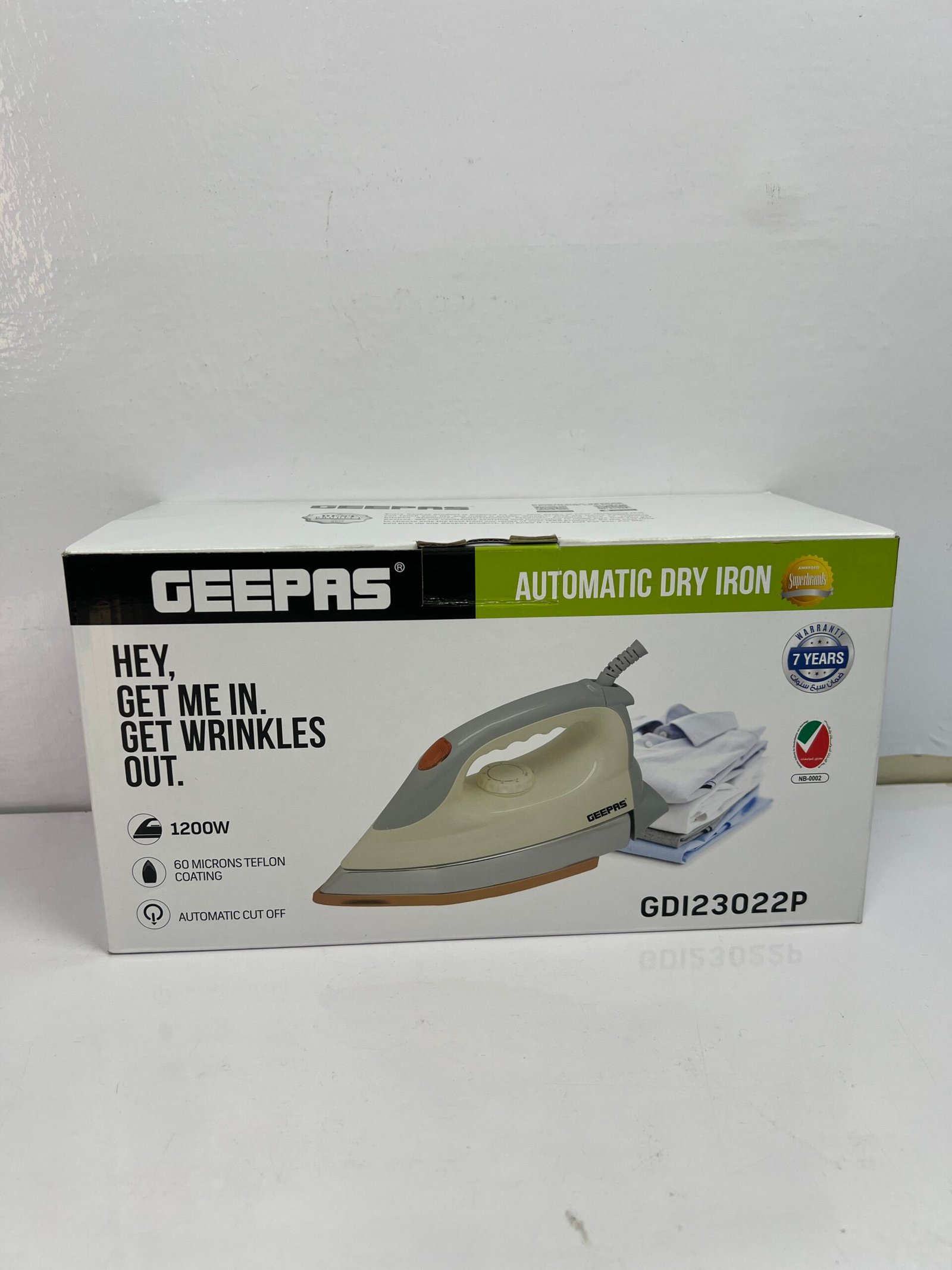 The Geepas Automatic Dry Iron GDI23021P offers powerful 1200W performance coupled with a 60 microns Teflon coated soleplate for smooth ironing. Its heavy-duty design ensures quick removal of wrinkles, while automatic power-off safety enhances peace of mind. Backed by a 7-year warranty, it is built to last.