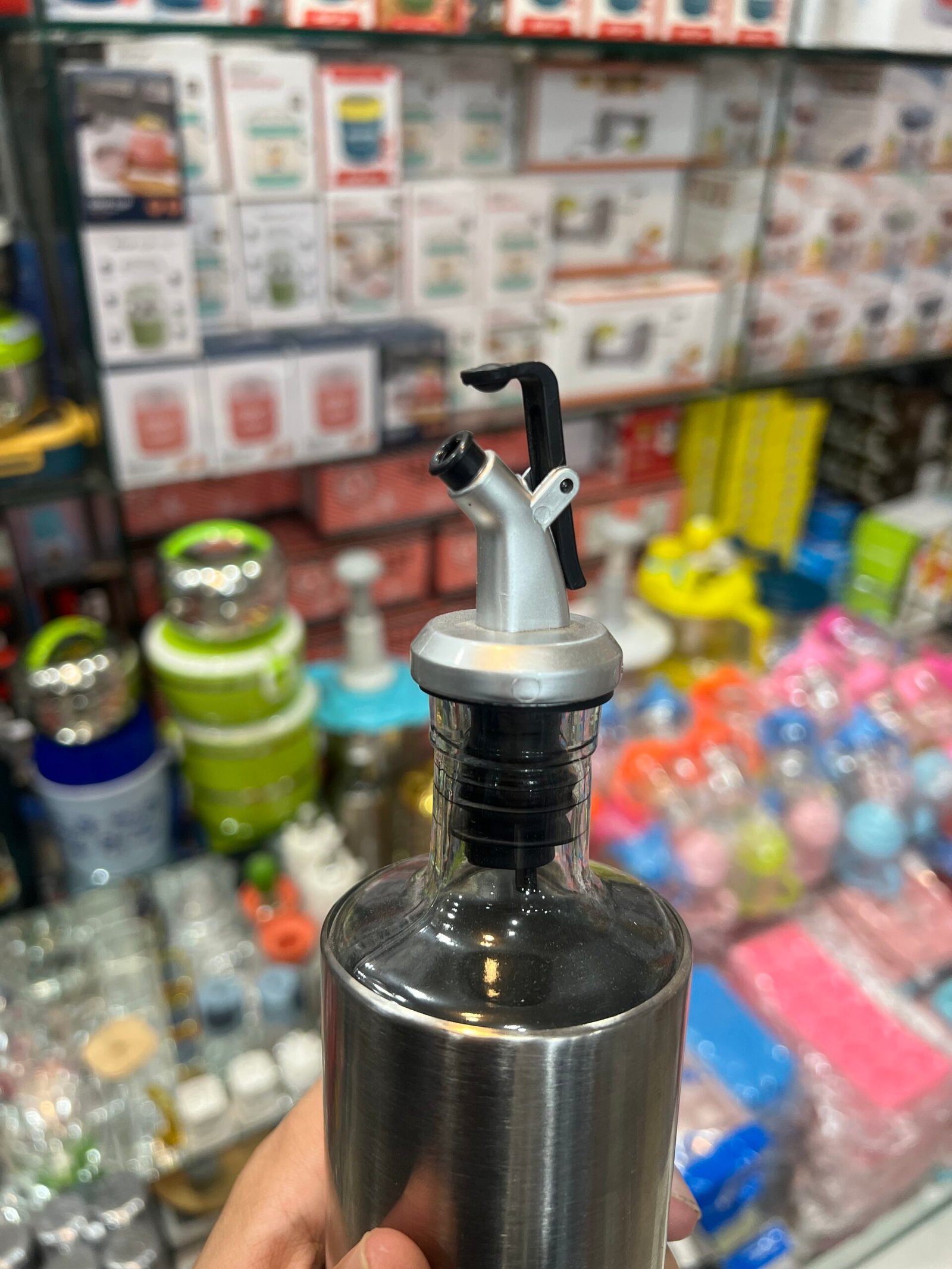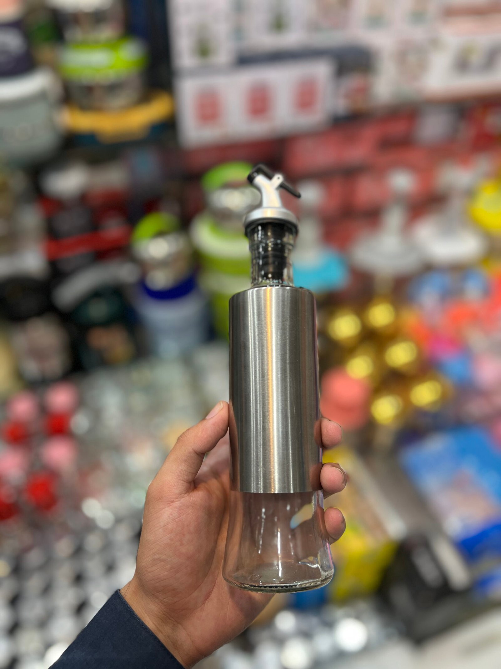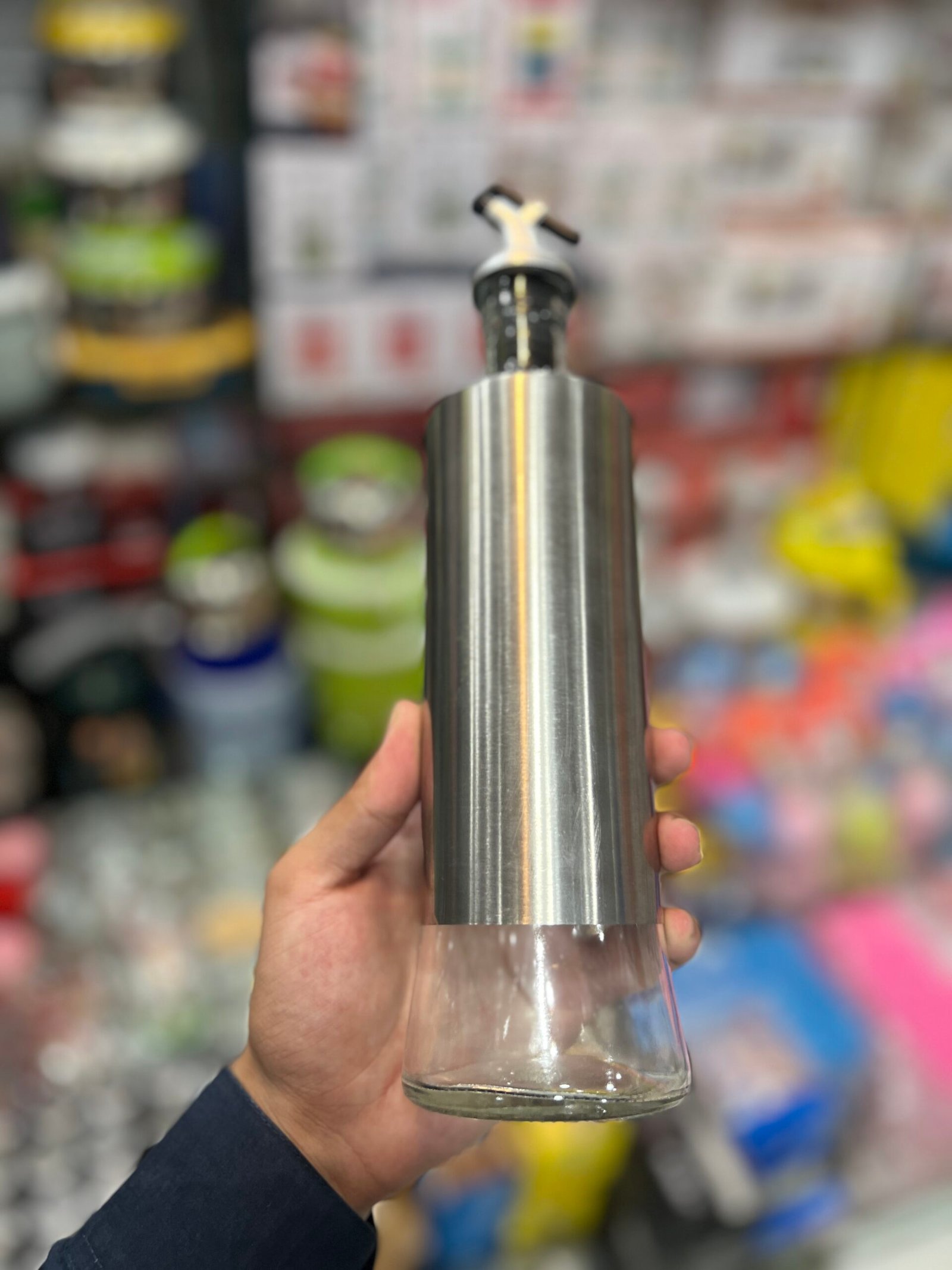 Glass Oil Container with Stainless Steel Touch, available in 300ml and 500ml