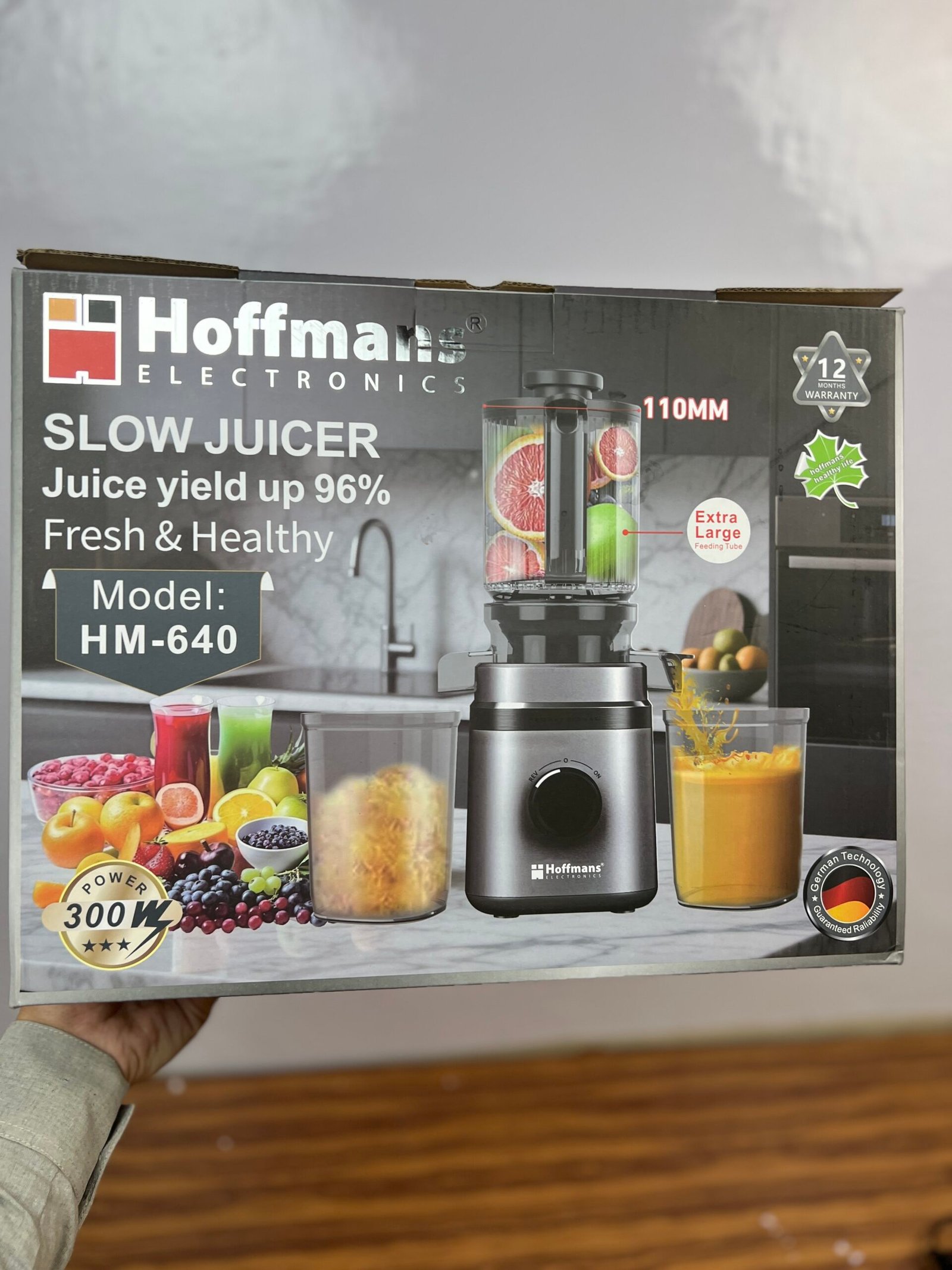 The Hoffman 300W Cold Press Juicer HM-640 is designed for maximum juice extraction from whole vegetables and fruits with minimal preparation. Featuring a powerful 300W full copper DC motor and slow 75 RPM rotation, it preserves nutrients while producing up to 96% juice yield. The extra-large 110mm feeding tube accommodates whole produce, reducing chopping time. Built with German technology and equipped with a high-quality stainless steel blade, this slow masticating juicer ensures efficient and healthy juicing. Ideal for fresh juice lovers who want quality and convenience in one appliance.