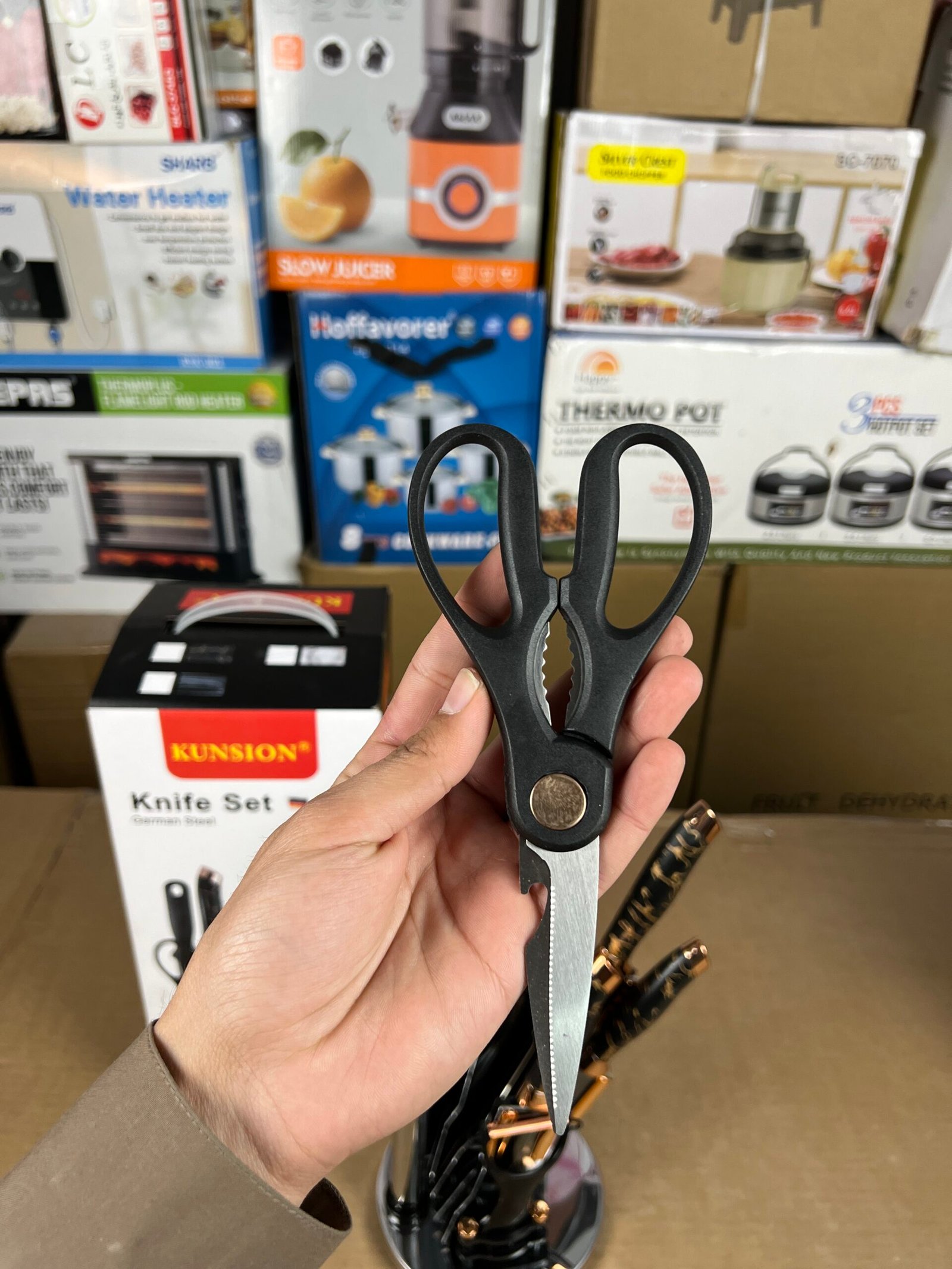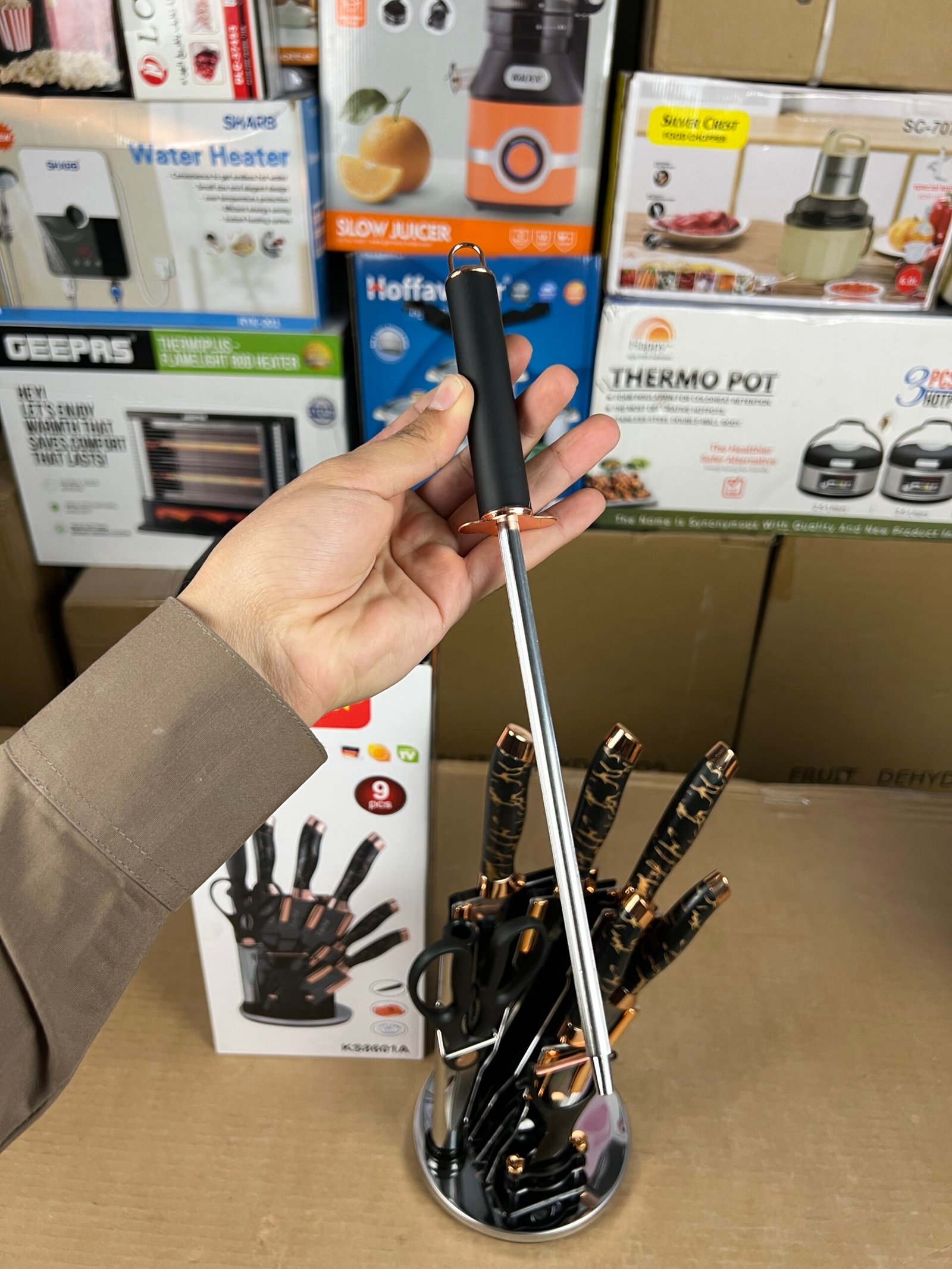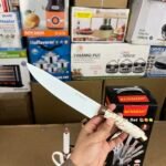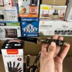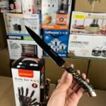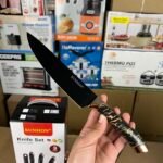- Components: The set usually includes a versatile range of knives, such as a chef’s knife, slicer, bread knife, paring knife, and vegetable knife, often accompanied by scissors and a storage block.