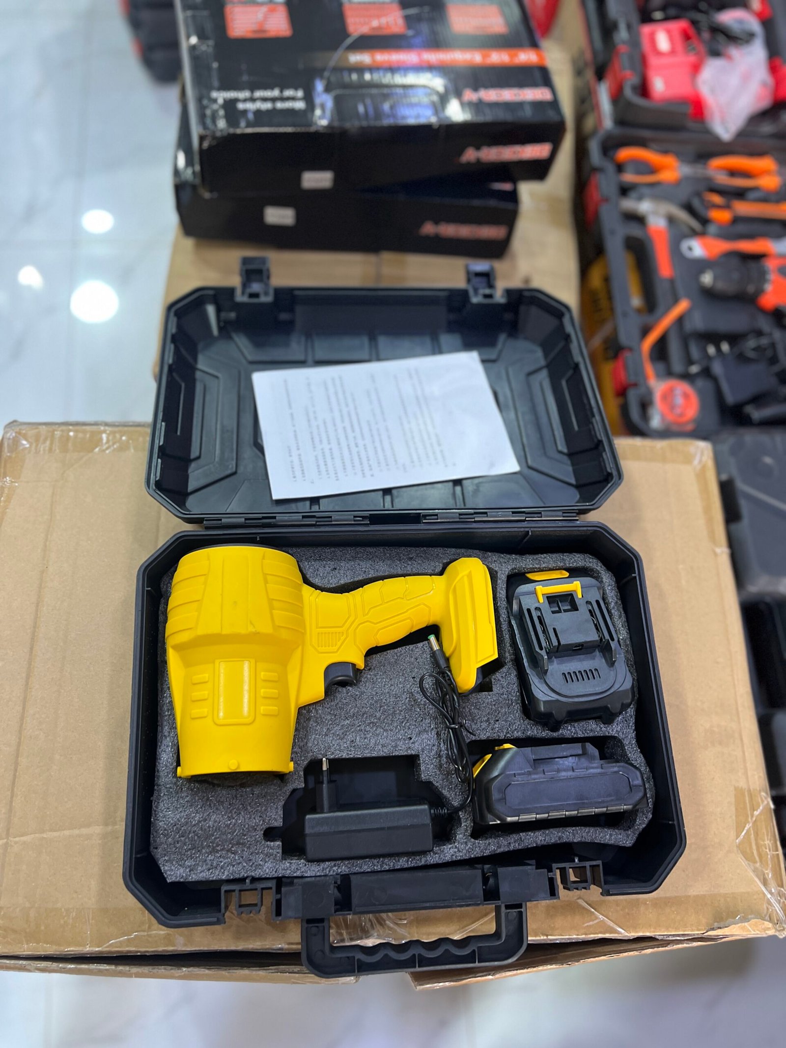 The Lot Imported Rechargeable Air Blower offers cordless freedom with two included rechargeable batteries. It delivers powerful blowing performance in a lightweight and durable design, making it ideal for cleaning dust, debris, and tight spaces efficiently. Its portability and reliability make it a versatile tool for home, office, or workshop use.